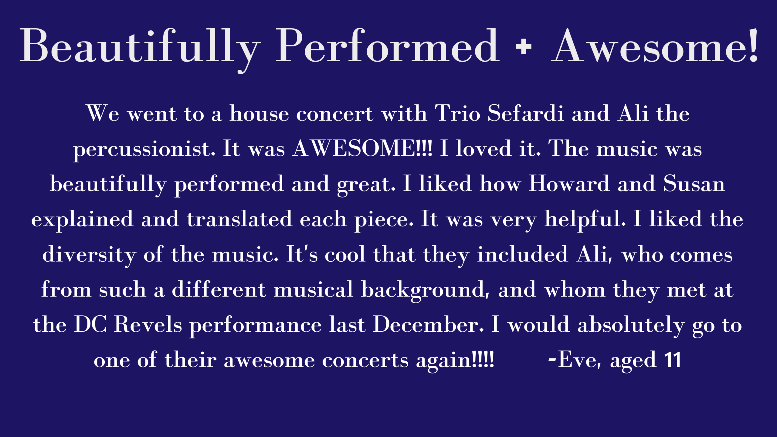 “Their harmonious musical instruments, engaging lectures and stories, and beautiful melodies make Trio Sefardi a ‘must have’ for any organization who wants to learn about and enjoy Sephardic music and culture.”